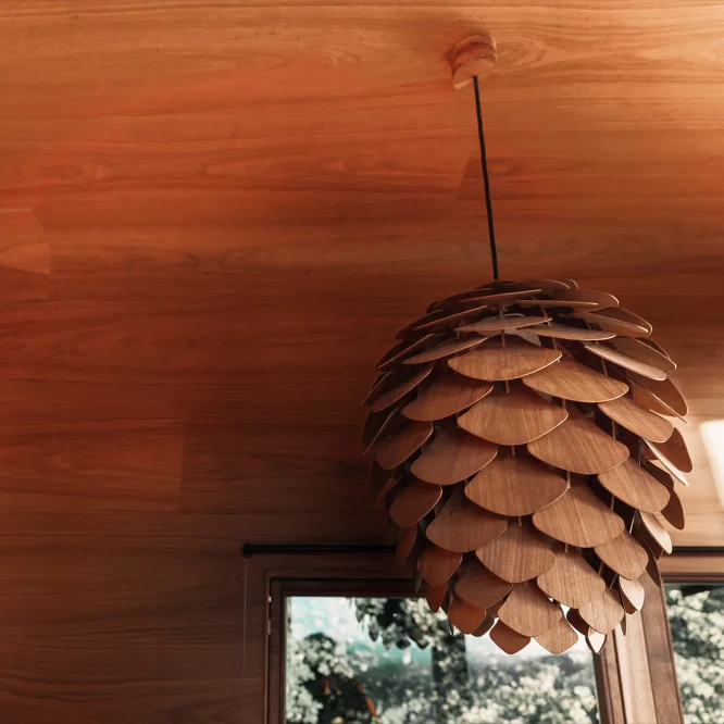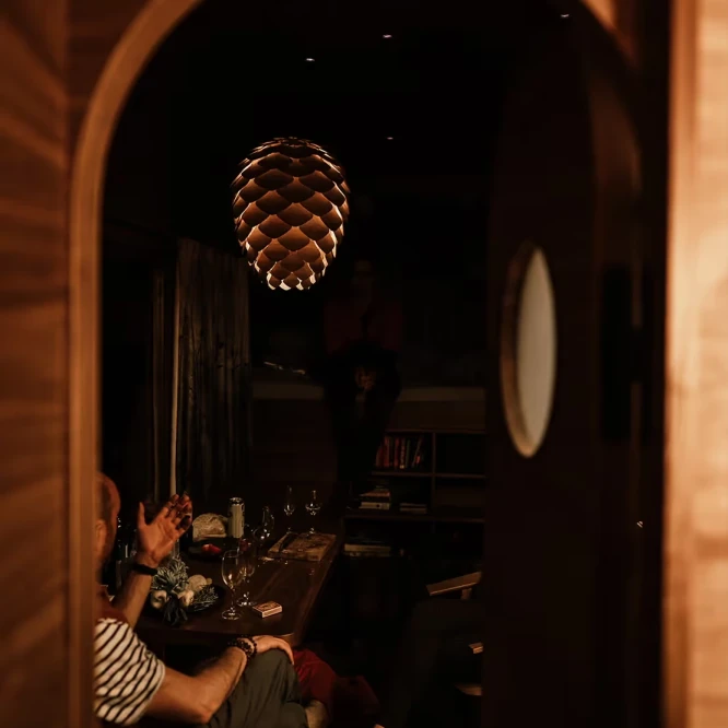 První prototyp lustru, pojmenovaný jednoduše „Šiška“, vznikl právě jako součást unikátního interiéru Aranky – jako prvek propojující přírodu a moderní design.